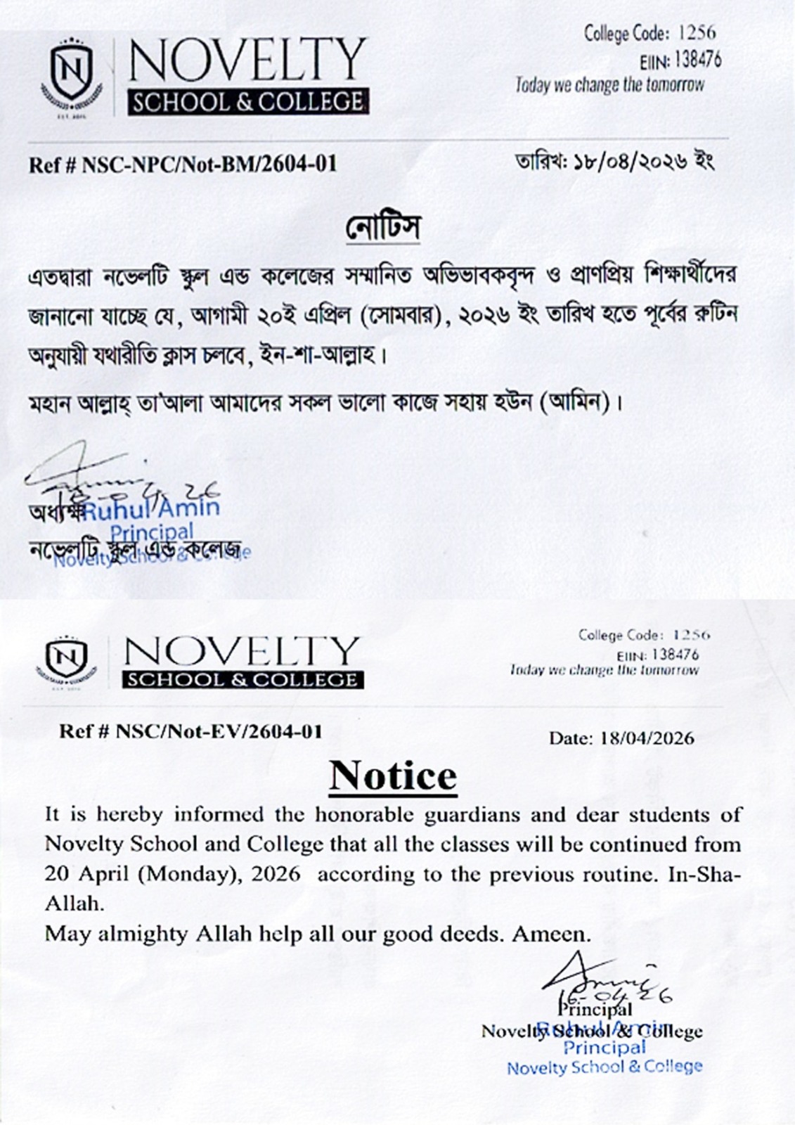 এতদ্বারা নভেলটি স্কুল এন্ড কলেজের সম্মানিত অভিভাবকবৃন্দ ও প্রাণপ্রিয় শিক্ষার্থীদের জানানো যাচ্ছে যে, আগামী ২০ই এপ্রিল (সোমবার), ২০২৬ ইং তারিখ হতে পূর্বের রুটিন অনুযায়ী যথারীতি ক্লাস চলবে, ইন-শা-আল্লাহ।