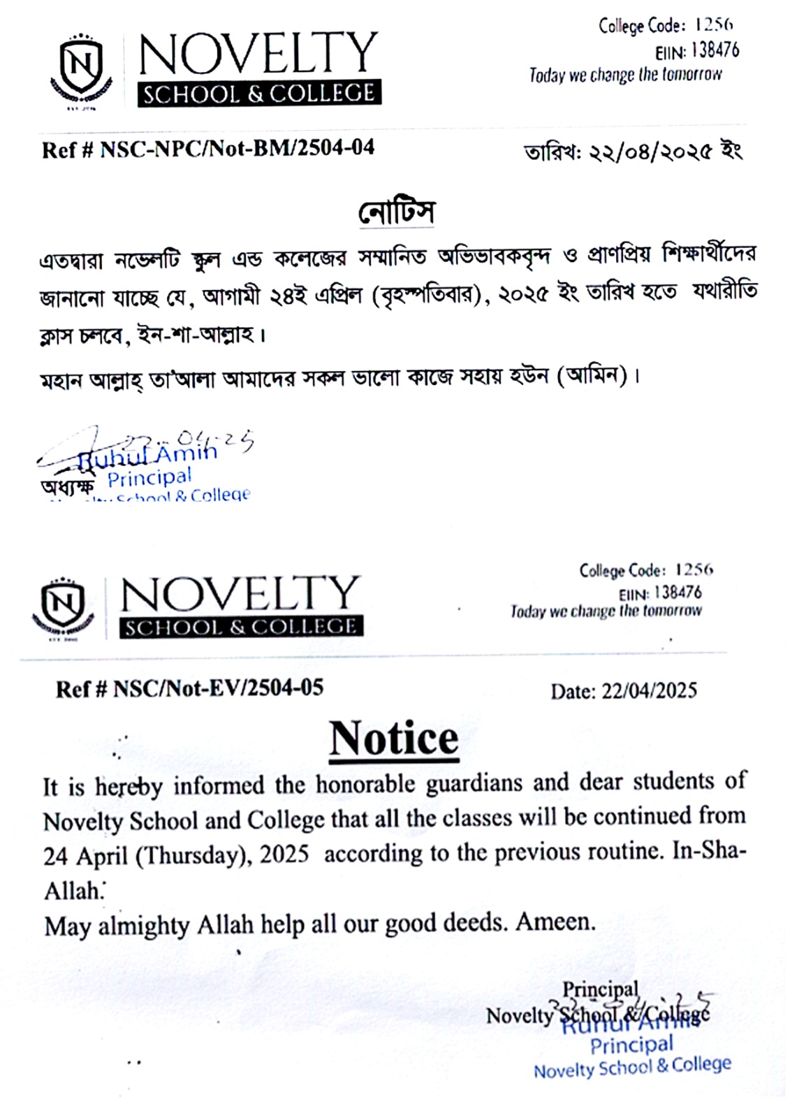 এতদ্বারা নভেলটি স্কুল এন্ড কলেজের সম্মানিত অভিভাবকবৃন্দ ও প্রাণপ্রিয় শিক্ষার্থীদের জানানো যাচ্ছে যে, আগামী ২৪ই এপ্রিল (বৃহস্পতিবার), ২০২৫ ইং তারিখ হতে যথারীতি ক্লাস চলবে, ইন-শা-আল্লাহ।