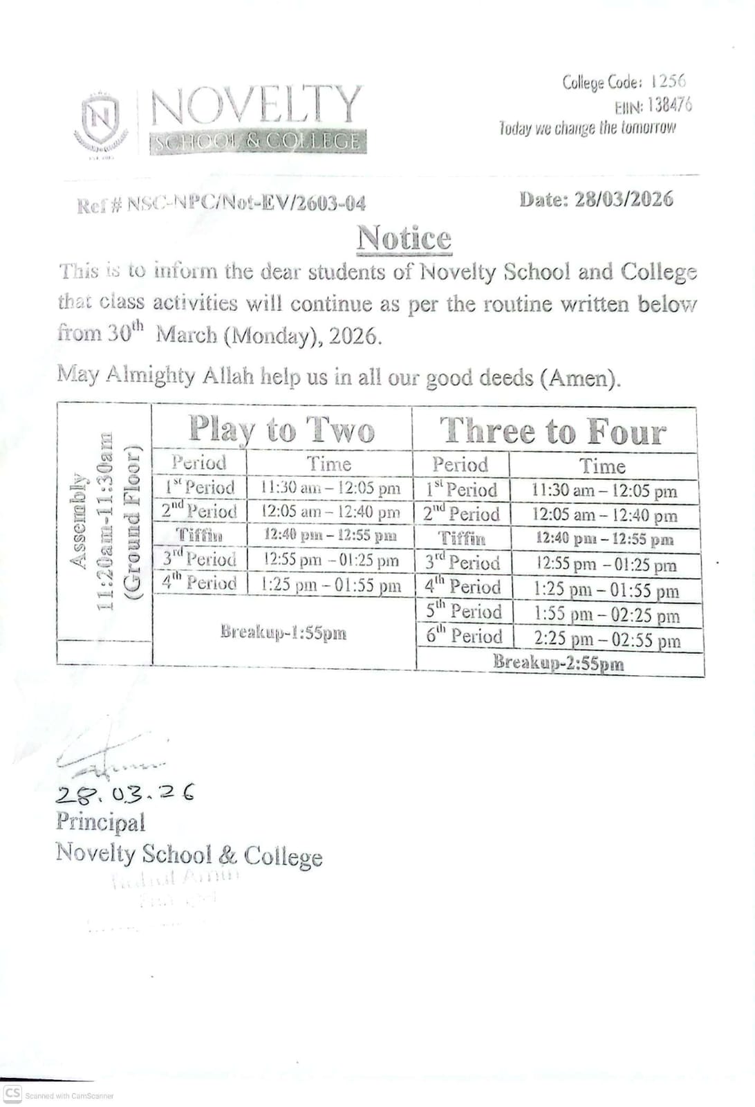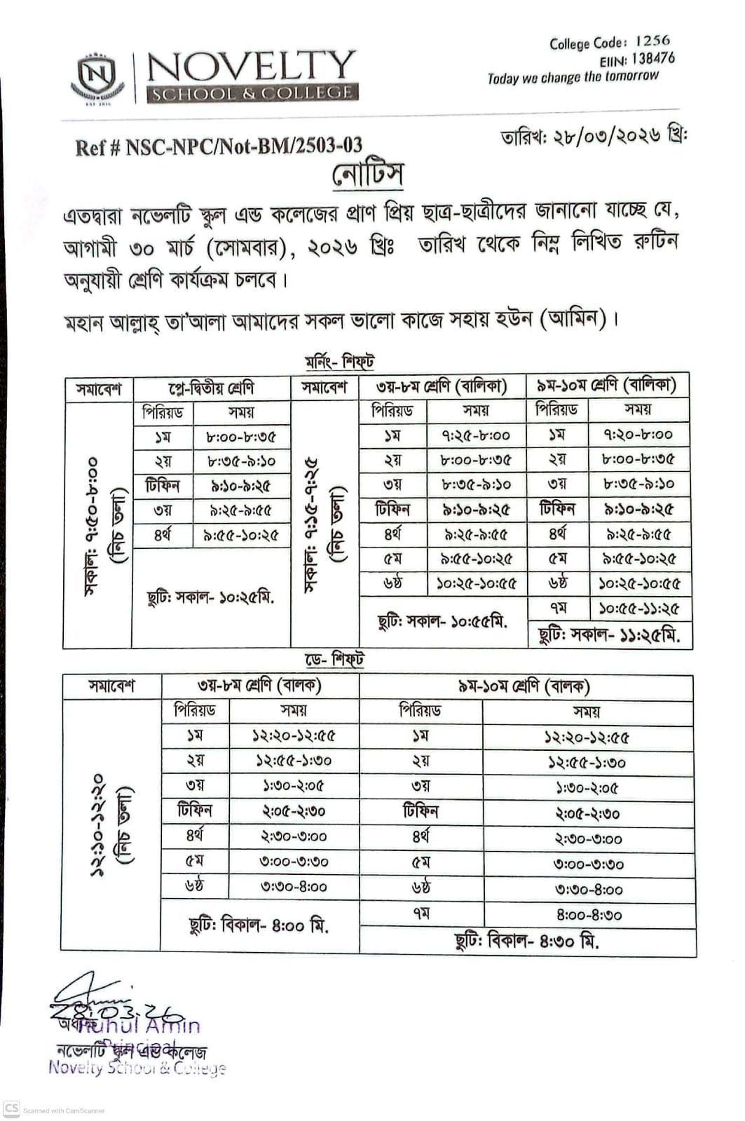 এতদ্বারা নভেলটি স্কুল এন্ড কলেজের প্রাণ প্রিয় ছাত্র-ছাত্রীদের জানানো যাচ্ছে যে, আগামী ৩০ মার্চ (সোমবার), ২০২৬ইং তারিখ হতে নিম্ন লিখিত রুটিন অনুযায়ী সকল শ্রেণির পূর্ণাঙ্গ শ্রেণি কার্যক্রম শুরু হবে, ইন-শা-আল্লাহ্।
