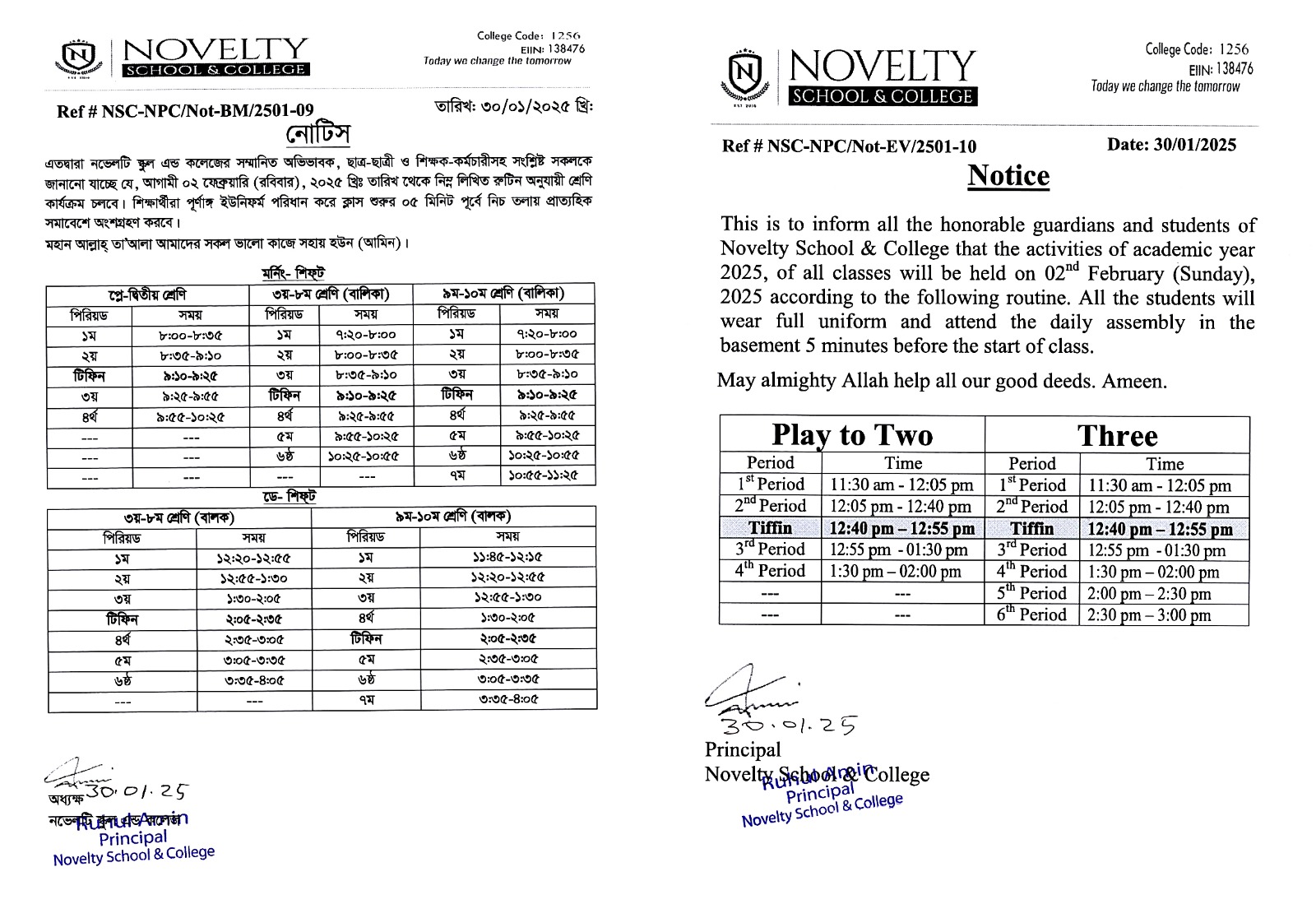 এতদ্বারা নভেলটি স্কুল এন্ড কলেজের সম্মানিত অভিভাবক, ছাত্র-ছাত্রী ও শিক্ষক-কর্মচারীসহ সংশ্লিষ্ট সকলকে জানানো যাচ্ছে যে, আগামী ০২ ফেব্রুয়ারি (রবিবার), ২০২৫ খ্রিঃ তারিখ থেকে নিম্ন লিখিত রুটিন অনুযায়ী শ্রেণি কার্যক্রম চলবে। শিক্ষার্থীরা পূর্ণাঙ্গ ইউনিফর্ম পরিধান করে ক্লাস শুরুর ০৫ মিনিট পূর্বে নিচ তলায় প্রাত্যহিক সমাবেশে অংশগ্রহণ করবে।