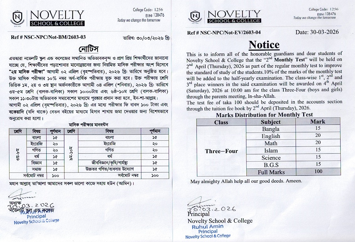 “২য় মাসিক পরীক্ষা” আগামী ০২ এপ্রিল (বৃহস্পতিবার), ২০২৬ খ্রি: তারিখে অনুষ্ঠিত হবে।