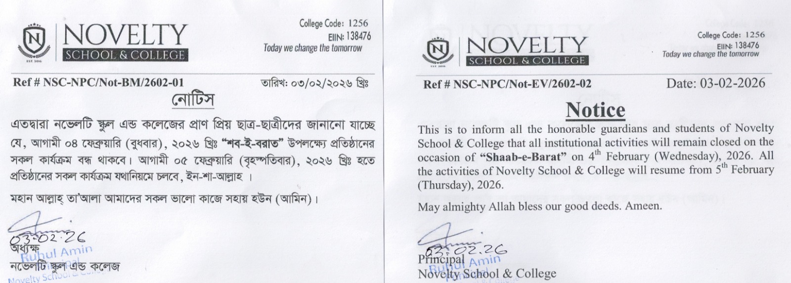 এতদ্বারা নভেলটি স্কুল এন্ড কলেজের প্রাণ প্রিয় ছাত্র-ছাত্রীদের জানানো যাচ্ছে যে, আগামী ০৪ ফেব্রুয়ারি (বুধবার), ২০২৬ খ্রিঃ “শব-ই-বরাত” উপলক্ষ্যে প্রতিষ্ঠানের সকল কার্যক্রম বন্ধ থাকবে। আগামী ০৫ ফেব্রুয়ারি (বৃহস্পতিবার), ২০২৬ খ্রিঃ হতে প্রতিষ্ঠানের সকল কার্যক্রম যথানিয়মে চলবে, ইন-শা-আল্লাহ ।