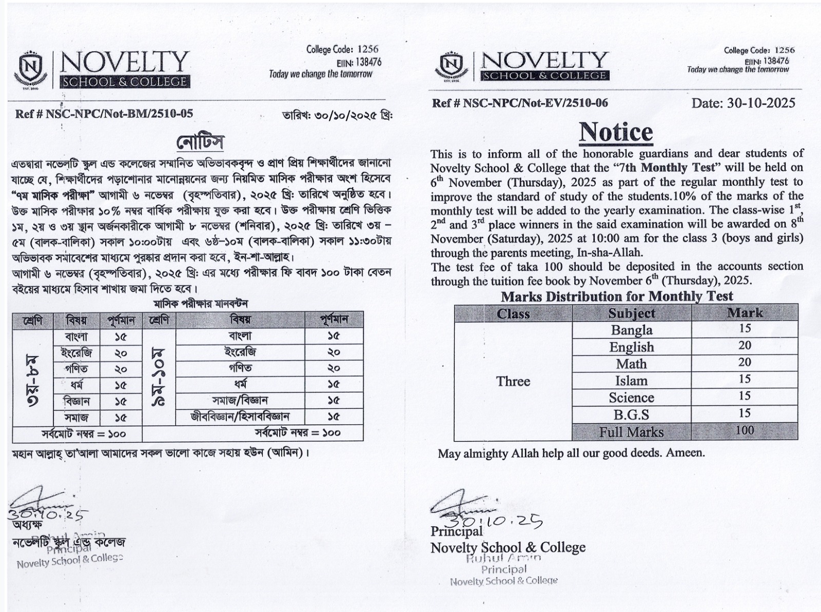 এতদ্বারা নভেলটি স্কুল এন্ড কলেজের সম্মানিত অভিভাবকবৃন্দ ও প্রাণ প্রিয় শিক্ষার্থীদের জানানো যাচ্ছে যে, শিক্ষার্থীদের পড়াশোনার মানোন্নয়নের জন্য নিয়মিত মাসিক পরীক্ষার অংশ হিসেবে “৭ম মাসিক পরীক্ষা” আগামী ৬ নভেম্বর (বৃহস্পতিবার), ২০২৫ খ্রি: তারিখে অনুষ্ঠিত হবে। উক্ত মাসিক পরীক্ষার ১০% নম্বর বার্ষিক পরীক্ষায় যুক্ত করা হবে। উক্ত পরীক্ষায় শ্রেণি ভিত্তিক ১ম, ২য় ও ৩য় স্থান অর্জনকারীকে আগামী ৮ নভেম্বর (শনিবার), ২০২৫ খ্রি: তারিখে ৩য় - ৫ম (বালক-বালিকা) সকাল ১০:০০টায় এবং ৬ষ্ঠ-১০ম (বালক-বালিকা) সকাল ১১:৩০টায় অভিভাবক সমাবেশের মাধ্যমে পুরষ্কার প্রদান করা হবে, ইন-শা-আল্লাহ।